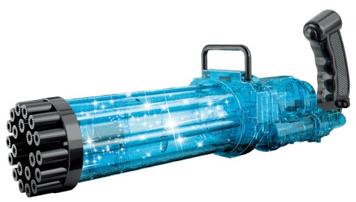 Karabin maszynowy Gatling ma 8 otworów na bąbelki, które mogą wydmuchać setki bąbelków na minutę. Ta maszyna do bąbelków może być używana jako letni wiatrak z wyjętą głowicą bąbelkową, gdy czujesz się zmęczony po pościgu