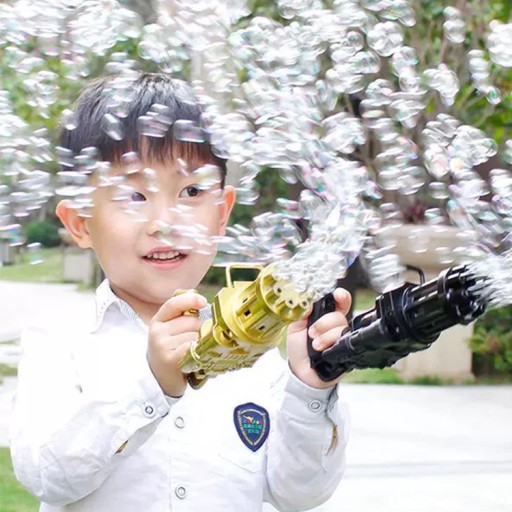 Maszyna do baniek Gatling może być również używana jako mały wentylator, aby zapewnić dzieciom chłodny i wygodny powiew wiatru, gdy są zmęczone. Wystarczy włożyć 3 baterie (brak w zestawie), kliknąć na płyn do bąbelków i pociągnąć za spust, wyskoczy wiele bąbelków!