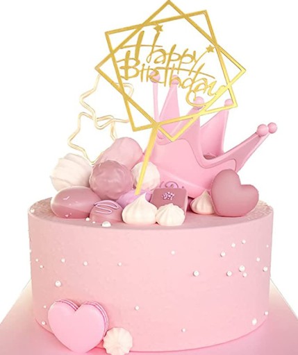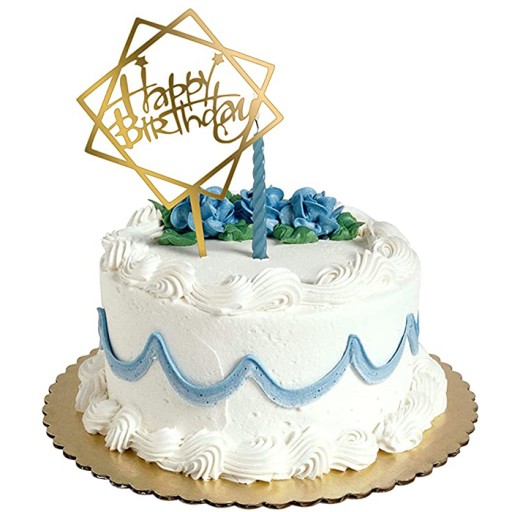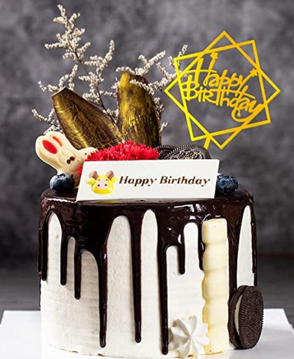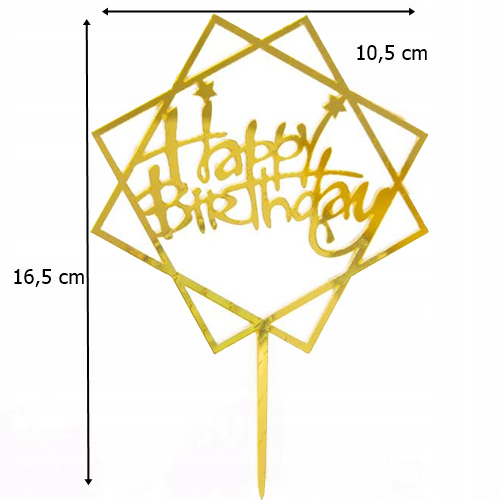 Elegancki, ozdobny, złoty topper Happy Birthday. To niewątpliwie piękny dodatek dekoracyjny na urodzinowy tort.