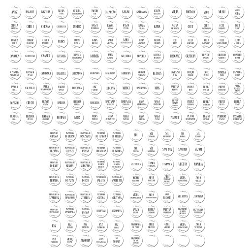 W zestawie znajduje się 185 już zadrukowanych naklejek z nazwami większości przypraw.