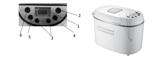 - 1. Wyświetlacz LCD - pokazuje numer wybranego programu, poziomu pieczenia, wagę chleba, czas pieczenia.