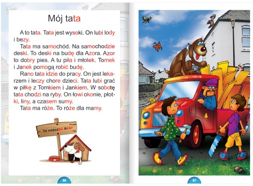 W całej książce zastosowano wyraźny podział na sylaby, przykładowe słówka, proste zdania, dzięki czemu dziecko szybko nauczy się czytać płynnie.