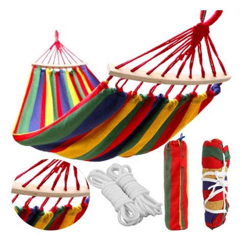 - Dzięki drewnianemu stelażowi hamak nie zawija się w rulon, solidne liny oraz materiał zapewniają długi czas użytkowania
