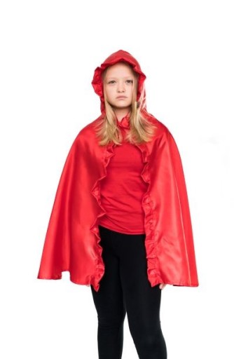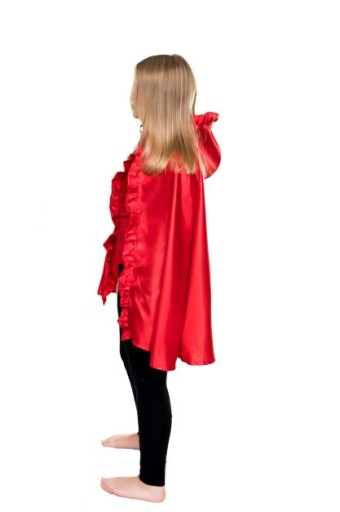 Śliczna peleryna w kolorze czerwonym z kapturkiem zdobiona falbanką.Długość około 70 cm.Wyprodukowano w Polsce.