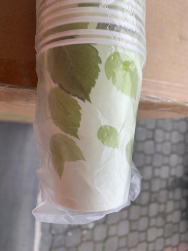 Białe kubki wykonane z PLA (skrobia kukurydziana), nadrukowane wzorem ekologicznym zielone liście (dwa wzory nadruku).