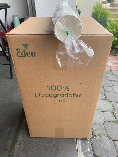 Oznaczenia dotyczące przydatności termicznej, kompostowalności i biodegradowalności nadrukowane na każdym kubku