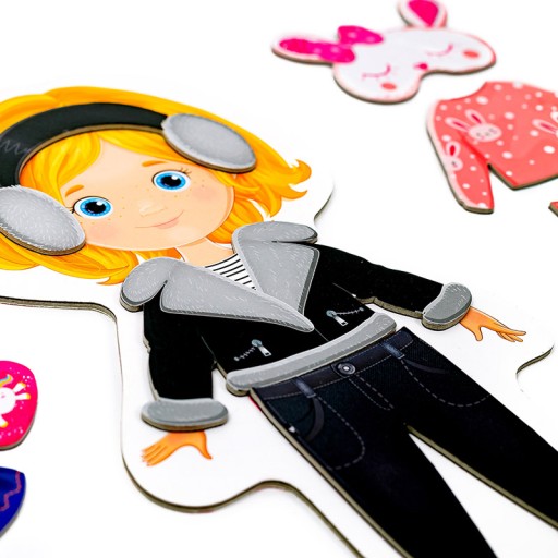Dobierajcie dla dziewczynki magnesowe elementy ubrań. Zestawiajcie przedmioty garderoby i twórzcie swój niepowtarzalny styl! W książeczce- instrukcji -znajdziecie wskazówki, w jaki sposób można łączyć ubrania i jakie obrazy można tworzyć.