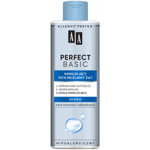 AA PERFECT BASIC NAWILŻAJĄCY PŁYN MICELARNY 3 w 1 zapewnia perfekcyjne oczyszczenie skóry, komfortowy demakijaż i pielęgnacyjne działanie odpowiadające na potrzeby skóry normalnej i odwodnionej.