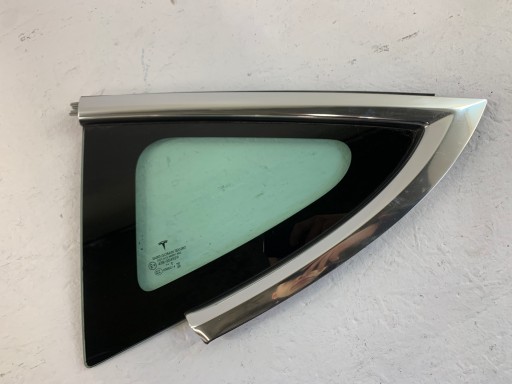 Tesla 3 szyba tylna karoseryjna lewa, USZKODZONY RANT CHROMU WIDOCZNE NA 3 foto szkło całe