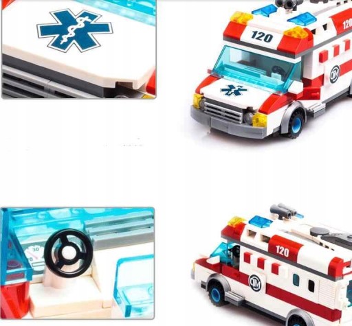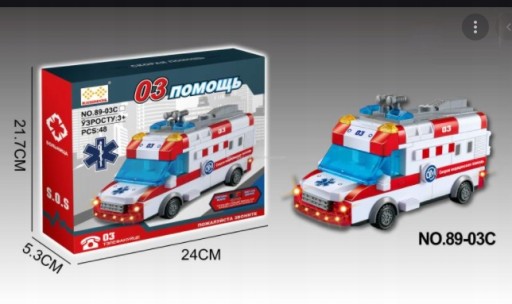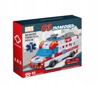 KLOCKI- KARETKA POGOTOWIA. 48 elementów do samodzielnego złożenia, Zapewni wspaniałą rozrywkę i satysfakcję z samodzielnego skonstruowania pojazdu. Wiernie odwzorowane amerykańskie auto ambulansu, które obraca się, świeci i daje sygnał. Zabawka idealna dla każdego chłopca i dziewczynki. Zestaw wymaga 3 baterii AA, brak w zestawie.