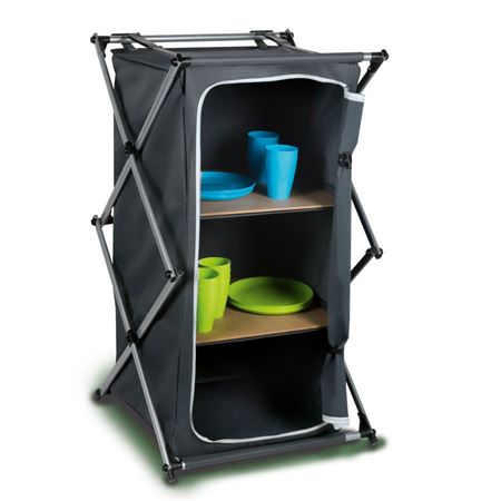 Praktycznie składana szafka kempingowa z dwiema solidnymi, wyjmowanymi półkami. Mała szafka składa się z lekkiej metalowej ramy i wytrzymałej tkaniny poliestrowej. Dwie półki zapewniają szafie kempingowej niezbędną stabilność i dużo miejsca do przechowywania naczyń, jedzenia, ubrań itp. Szafkę można zamknąć nieprzezroczyście prostym zamkiem błyskawicznym. Po złożeniu posiada praktyczny pasek na ramię, dzięki czemu można go łatwo zabrać ze sobą.