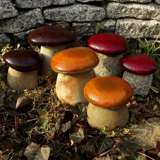 Zestaw 6 sztuk grzybków ogrodowych wykonanych z naturalnego kamienia, z każdego koloru duży i mały. Figurki są odporne na warunki atmosferyczne. Doskonała dekoracja na skalniak, rabatę czy pod iglaki. Każdy zestaw jest troszkę inny ponieważ wykonany jest z naturalnych kamieni otoczaków.