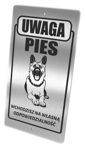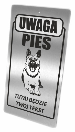 Tabliczka ostrzegawcza ze stali nierdzewnej z wybranym wizerunkiem psa i spersonalizowanym napisem