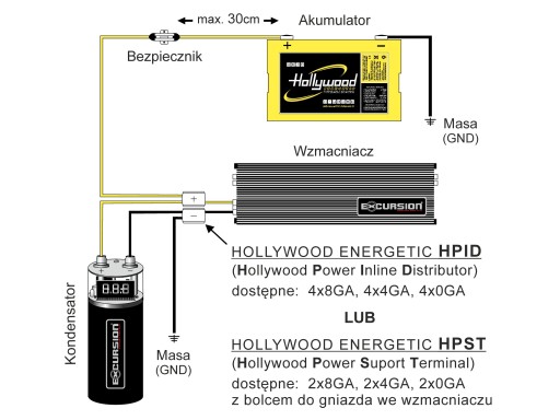 - Hollywood HPST8 ACS - podłączenie kondensatora bezpośrednio do gniazda wzmacniacza z terminalami śrubowymi dla przewodów o przekroju 10 mm2.