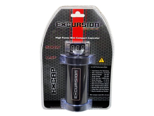 Excursion HX CAP Bardzo wydajny mini kondensator o pojemności 0,5 Farada z woltomierzem niemieckiej marki Excursion do poprawy stabilności i efektywności instalacji zasilającej system car audio. Dzięki zastosowaniu najnowszej technologii HDFT (High Density Foil Technology) ze zwiększoną gęstością wewnętrznych folii elektrodowych możliwe było uzyskanie wysokiej wydajności przy zachowaniu bardzo małych wymiarów obudowy. Kondensator Excursion HX CAP jest w stanie pełnić funkcję efektywnego banku energii stabilizującego impulsowe spadki i wahania napięcia w instalacjach zasilających systemy car audio o mocy do 500 W. Wysoka wydajność i niewielkie wymiary kondensatora to jedne z ważniejszych parametrów w dobie coraz mniejszych i mocniejszych wzmacniaczy cyfrowych powszechnie stosowanych w instalacjach car audio. Dzięki temu miniaturowy Excursion HX CAP stwarza większe możliwości montażu w trudniej dostępnych miejscach samochodu. Likwiduje też wiele ograniczeń przeszkadzających dotychczas w tym, aby taki dodatkowy bank energii dla wzmacniacza mocy zawsze był zainstalowany możliwie jak najbliżej niego. Głównym zastosowaniem kondensatora Excursion HX CAP jest jego montaż bezpośrednio przy wzmacniaczu mocy lub wzmacniaczu z procesorem DSP zasilanym wiązką typu ISO Plug&Play z przewodami o niezbyt dużym przekroju. Niewielka średnica (51 mm) sprawia, że kondensator ten również bardzo dobrze wizualnie pasuje do montażu obok wzmacniaczy Excursion z serii HXA o podobnej wysokości.