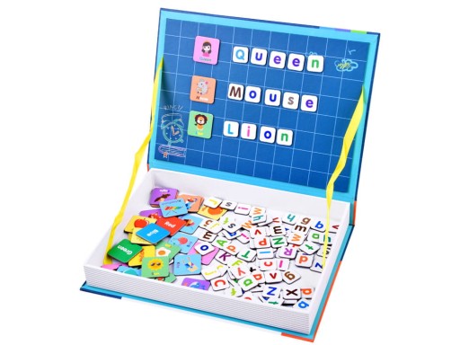Alfabet nauka liter, słówek od najwcześniejszych lat zawsze jest dobra. Zestaw składa się aż z 134 elementów, w skład których wchodzą literki małe i duże, obrazki z nazwami w j. angielskim oraz obrazki z kolorem. Cały zestaw magnetycznego alfabetu zamknięty jest w twardej oprawie imitującej książkę. Po otwarciu literki, obrazki można przyklejać na tablicy magnetycznej.