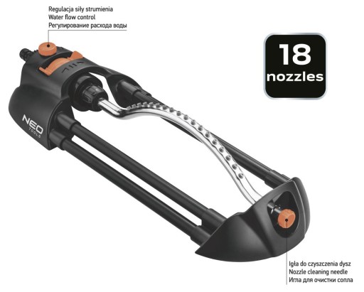 Zraszacz oscylacyjny, 15-771, NEO, przeznaczony jest do nawadniania trawników, ogrodów i upraw. Umożliwia jednoczesne podlewania roślin na powierzchni 14x19 m. Został wyposażony w 18 dysz wylotowych, umieszczonych na metalowym pałąku. Zraszacz ma suwaki, które dają możliwość ustawienia jego zakresu ruchów. Dodatkowo urządzenie ma pokrętło, które pozwala na regulację siły strumienia, co ułatwia zmianę zasięgu zraszania.