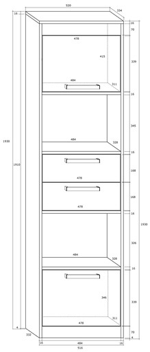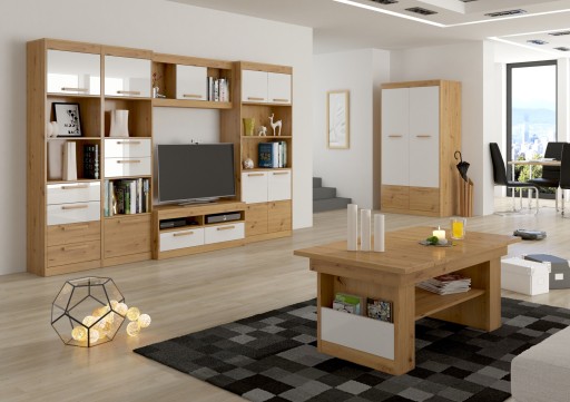 W meblach zastosowana została płyta wiórowa o grubości 16mm i 25 mm oklejona obrzeżem ABS. Szuflady i drzwi posiadają "cichy domyk".