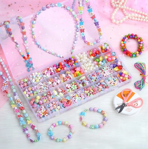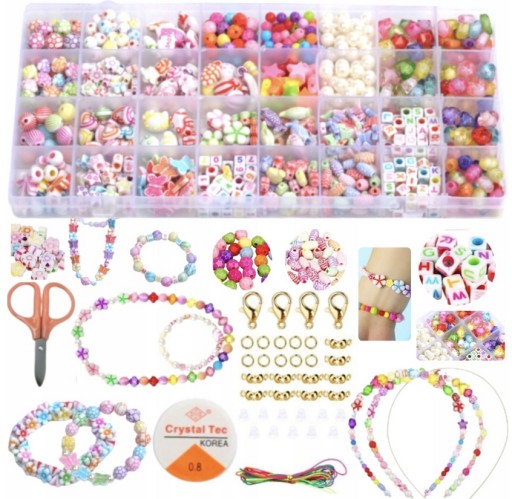 Zestaw elementów do samodzielnego wykonywania bransoletek, naszyjników, opasek na włosy, zawieszek oraz wszelkiego rodzaju ozdób. W zestawie znajdziemy literki, cyferki, kwiatki, motylki, serduszka, gwiazdki i wiele innych kolorowych koralików. Stworzone plecionki można ozdobić kolorowymi zawieszkami. Z literek możemy ułożyć imię dziecka co nada bransoletce indywidualny charakter. Zestaw to idealny prezent dla każdej pociechy oraz wspaniale spędzony czas.