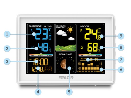- Stacja pogodowa z wbudowanym higrometrem pozwala kontrolować i utrzymywać odpowiedni mikroklimat w pomieszczeniach.