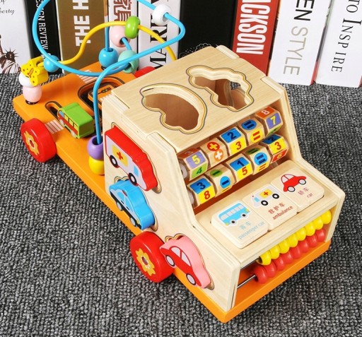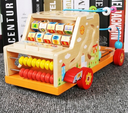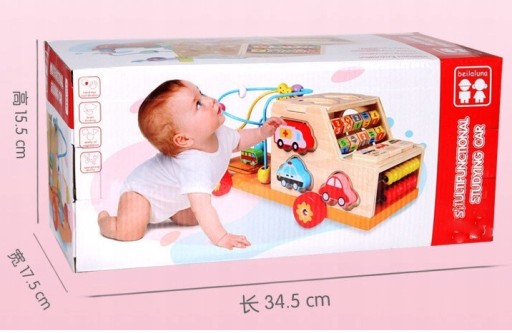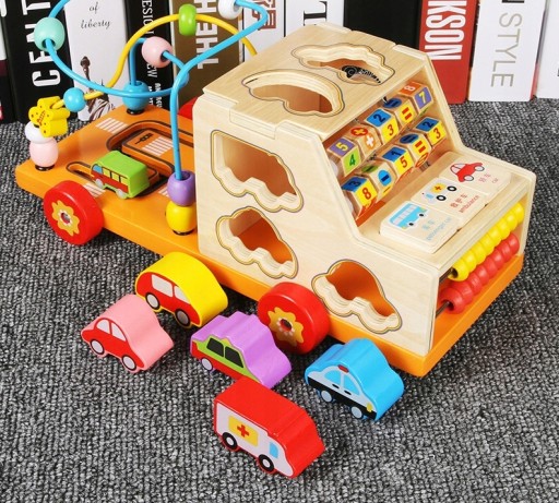 Ciężarówka z SAMOCHODZIKAMI to drewniany sorter z liczydłem , który rozwinie u Twojego dziecka koordynację oraz umiejętność logicznego myślenia. Zabawa polega na dopasowaniu różnych zwierzątek do odpowiednich otworów. Do dopasowania kształtów służą łącznie 3 ścianki pojazdu. Klocki w łatwy sposób można wyciągnąć .