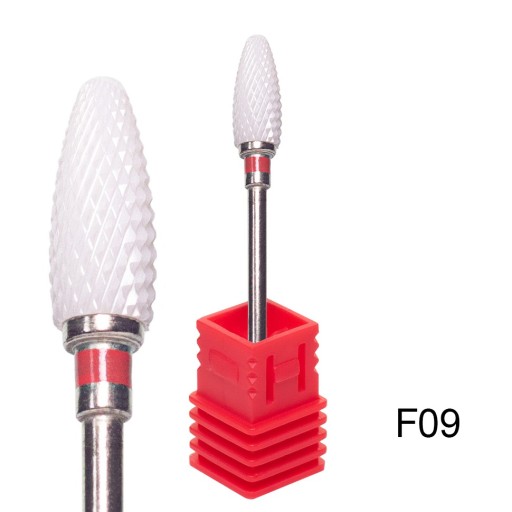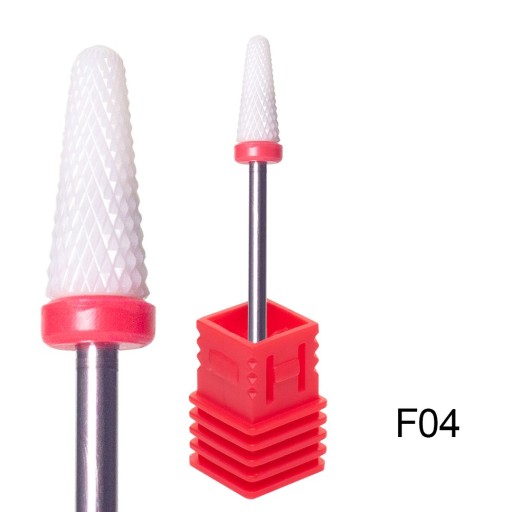 Frez ceramiczny w kształcie zaokrąglonego stożka służy do usuwania masy z całej płytki paznokcia oraz trudno dostępnych brzegów.