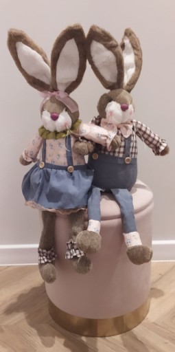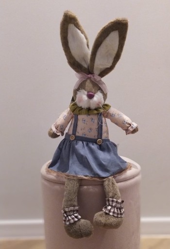 Zajączek posiada ubranko wykonane z płótna jutowego, ruchome uszy oraz zwisające nóżki dzięki czemu można go posadzić na szafce czy konsoli.