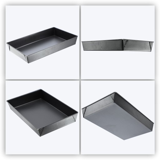 Prostokątna forma do pieczenia jest wykonana z blachy z nieprzywierającą powłoką, odpornej na działanie wysokich temperatur. Blacha przystosowana jest do kontaktu z żywnością i całkowicie bezpieczna dla zdrowia, ponieważ nie wydziela szkodliwych substancji podczas pieczenia.