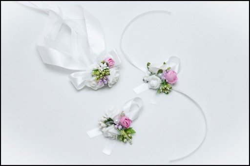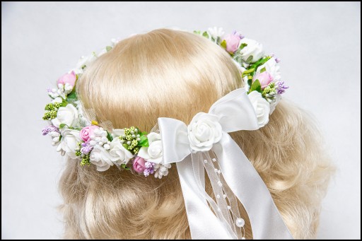 Wianek wykonany ręcznie z kwiatków piankowych oraz dodatków florystycznych, realistyczny wygląd kwiatów nadaje delikatnego i eleganckiego wyglądu dziewczynce w tym ważnym dniu