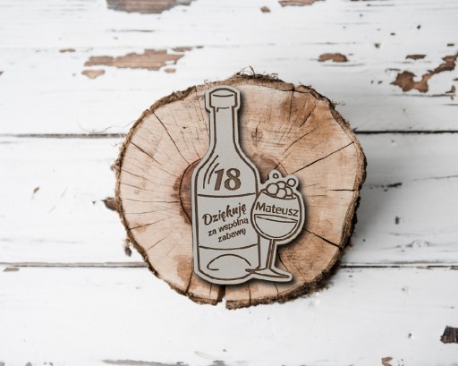 Podziękowanie dla gości za przybycie na imprezę z okazji 18 urodzin Miłym gestem jest podziękować gościom za przybycie na uroczystość , malutkim podarunkiem , który uwieczni piękną chwilę, a drewniany magnes będzie zawsze przypominał uroczystość.