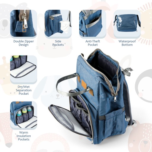 Wielofunkcyjny plecak na pieluchy od marki Amzdeal. Jest wodoodporny i izolowany od wewnątrz, dzięki czemu dłużej utrzymuje temperaturę napoju. Wyróżnia się również modnym designem i łącznie 15 schowkami. Wyściełane pianką paski gwarantują wygodę i doskonałe rozłożenie obciążenia. Dwa praktyczne paski bagażowe z tyłu umożliwiają przymocowanie go do wózka. Dołączona mata do przewijania jest grubo wyściełana i wodoodporna. Łatwo go złożyć i schować do plecaka.