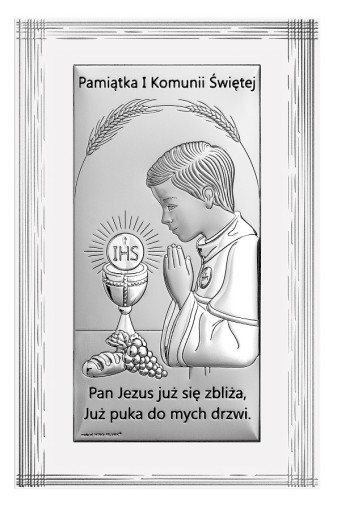Srebrny Obrazek modlącym dzieckiem i eucharystią - idealny jako prezent na Pierwszą Komunię Świętą.