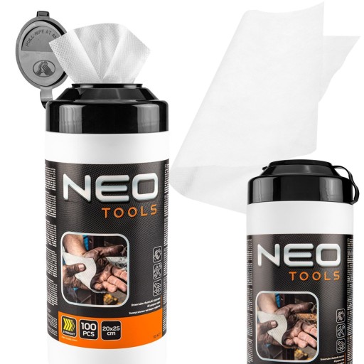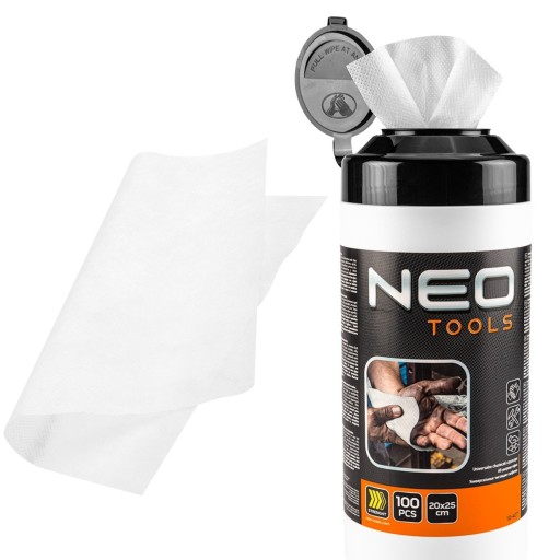 Chusteczki do mycia rąk oraz czyszczenia powierzchni i narzędzi z trudnych zabrudzeń, słoik 100 szt. NEO (nr ref. 10-407) o zapachu cytrusowym usuną trudne zabrudzenia z dłoni, narzędzi i innych powierzchni. Przeznaczone dla fachowców pracujących w budownictwie, motoryzacji, poligrafii, lakiernictwie. W wygodnej formule jednorazowych chusteczek, pomagają pozbyć się plam po specjalistycznych klejach, żywicy, silikonie, lakierach, farbach, piankach poliuretanowych oraz polimerach. Chusteczki zawierają naturalne drobinki ścierające z krzemionki. Posiadają naturalne pH dla skóry. W słoiku znajduje się 100 sztuk chusteczek.
