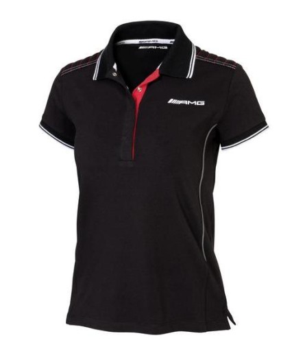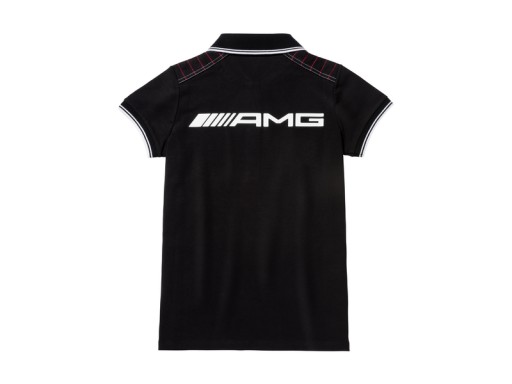Damska koszulka polo w kolorze czarnym. Z logo AMG z przodu. Wykonana w 95% z bawełny i w 5% z elastanu. Stylowa i wygodna. Posiada ozdobne pasy w kolorze białym, szarym i czerwonym. Na plecach znajduje się duże logo 3D AMG w kolorze białym.