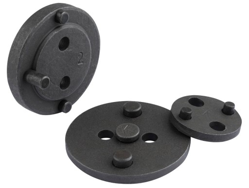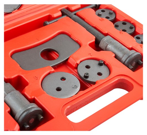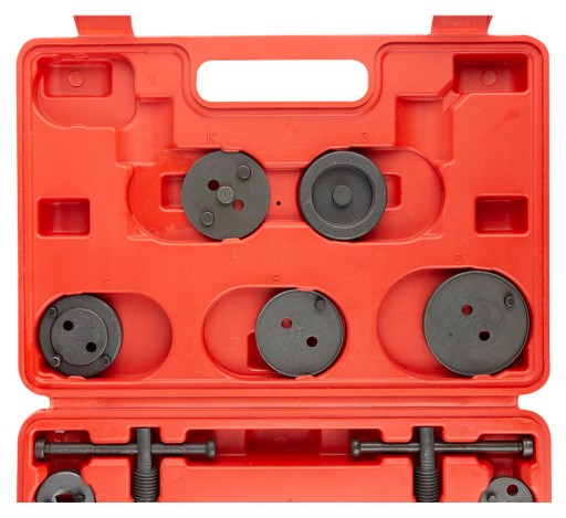 W zestawie znajdują się dwie prasy (prawo i lewo skrętna), dwie różnego kształtu belki do zapierania prasy o siodło zacisku oraz kilkanaście adapterów dostosowanych do wielkości tłoczków hamulcowych stosowanych w większości samochodów osobowych. Pokrętło wyposażone w magnetyczną końcówkę utrzymującą każdy adapter.