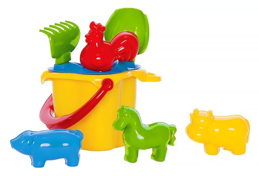 Zestaw zawiera wiaderko, grabki, łopatkę, sitko oraz 4 foremki