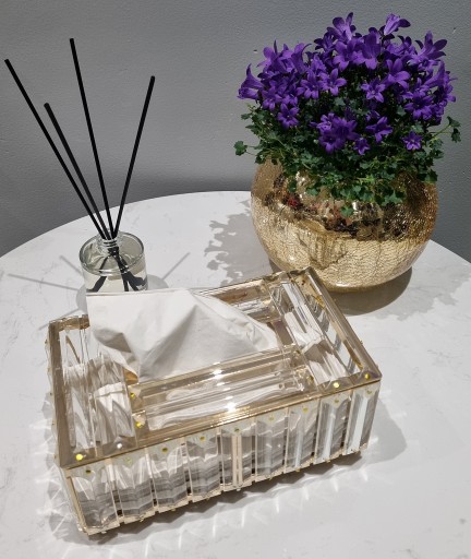 Pudełko na chusteczki z kryształami po bokach, a także górnej postawie. Dno pojemnika jest metalowe, zakończone czterema podnóżkami okrągłymi. Otwór jest w kształcie prostokąta.