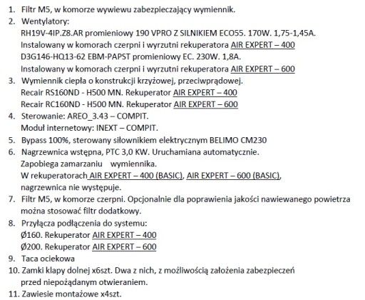 - WENTYLATORY – zastosowane zostały silniki elektro komutatorowe prądu stałego (EC) renomowanych firmy ZILABEG, EBM, ROSENBERG, dające gwarancję niezawodności oraz energooszczędnej cichej pracy. Silniki EC zapewniają wysoką wydajność i regulację w pełnym zakresie prędkości obrotowej wentylatora. Niewątpliwą zaletą silnika EC jest jego wysoki współczynnik KPD (do 90%).
