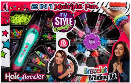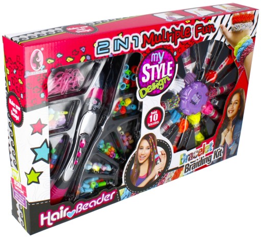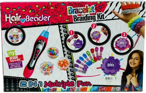 Rewelacyjny zestaw piękności 2w1 do ozdabiania włosów oraz robienia bransoletek dla małej stylistki mody.