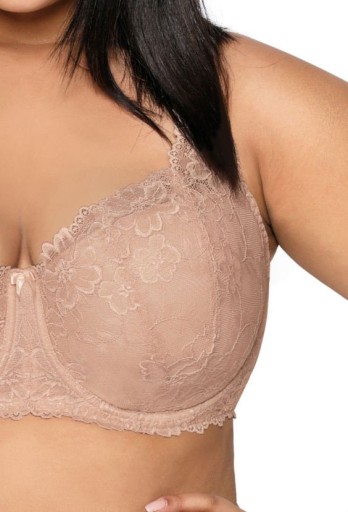 Zjawiskowy biustonosz Carmela. Pięknie prezentuje się na każdym biuście. Miseczki wykonane z finezyjnej koronki, która otula seksownie piersi i delikatnie pnie się po ramiączku. Zgrabne miseczki osadzone na koronkowym bawecie. Plecy gładkie z dzianiny elastycznej, wzmocnione fiszbiną pionową. Ramiączka regulowane, nieodpinane. Haftka dwurzędowa z trójstopniową regulacja.