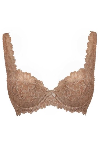 Zjawiskowy biustonosz Carmela. Pięknie prezentuje się na każdym biuście. Miseczki wykonane z finezyjnej koronki, która otula seksownie piersi i delikatnie pnie się po ramiączku. Zgrabne miseczki osadzone na koronkowym bawecie. Plecy gładkie z dzianiny elastycznej, wzmocnione fiszbiną pionową. Ramiączka regulowane, nieodpinane. Haftka dwurzędowa z trójstopniową regulacja.