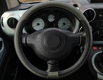 Pokrowiec na kierownicę wykonany z wysokiej jakości ekoskóry perforowanej połączonej z ekoskórą gładką.