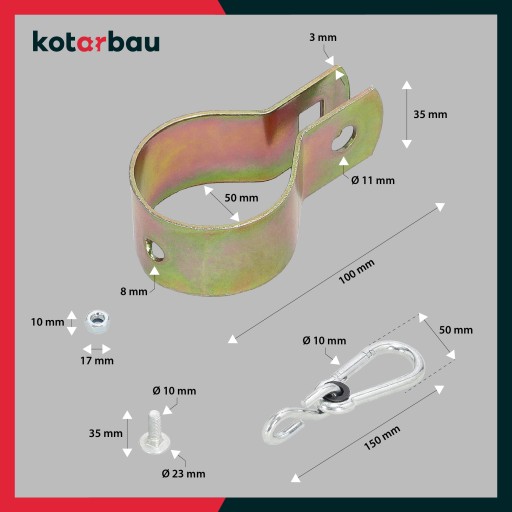 Hak z karabińczykiem firmy KOTARBAU charakteryzuje się najwyższą jakością. Dobór materiałów, z których jest wykonany zapewnia trwałość produktu. Obejma jest niezawodna przede wszystkim na zewnątrz, ale także w pomieszczeniach. Najlepszy materiał, z którego wykonany jest produkt oraz ocynkowana powierzchnia zabezpiecza towar przed uszkodzeniami mechanicznymi oraz rdzą.