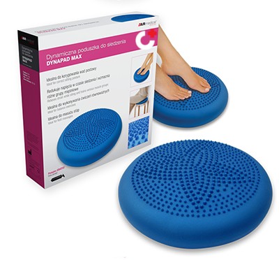 Poduszka dynamiczna Dynapad Max to sprzęt o szerokim spektrum zastosowania. Świetnie sprawdzi się jako urozmaicenie standardowego treningu, ale coraz częściej wykorzystywana jest również w rehabilitacji. Tworzenie niestabilnego podłoża pozwala na wykonywanie ćwiczeń równoważnych, które poprawiają balans ciała, zwiększają koordynację ruchową, ale też wzmacniają mięśnie głębokie stabilizujące całą sylwetkę. Dysk posiada dwie powierzchnie: gładką i z wypustkami. Ta druga może stanowić element terapii integracji sensorycznej, ale wykorzystywana jest również jako masażer do stóp. Poduszka pneumatyczna DSC-35 stosowana jest jako wsparcie podczas siedzenia, które wymusza prawidłową postawę i odciąża odcinek lędźwiowy kręgosłupa. Jej matowa powierzchnia zapobiega zsuwaniu ciała i zwiększa bezpieczeństwo podczas ćwiczeń. Za pomocą specjalnego zaworu można dopasować stopień twardości do indywidualnych potrzeb. Ułatwia to dołączona do zestawu pompka.