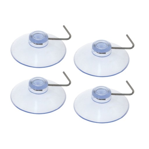 Zestaw czterech praktycznych, przezroczystych przyssawek z metalowymi haczykami, przeznaczonych do zawieszania lekkich przedmiotów: