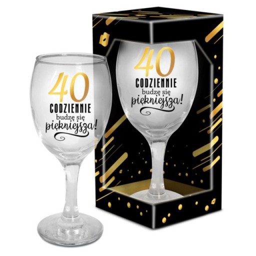 Szklany kieliszek na wino z czarno-złotym nadrukiem na 40-ste urodziny - Codziennie budzę się piękniejsza! Pojemność kieliszka: 220 ml. Zapakowany w stylistycznie dopasowany kartonik.