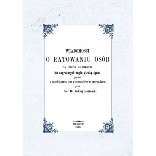 Reprint oryginału z 1870 roku. Książka, która od 1839 roku do końca XIX wieku była obowiązującym tytułem w urzędach powiatowych i gminnych, zakładach leczniczych i farmaceutycznych, jako poradnik do ratowania ludzi. Znajdują się tu informacje odnośnie udzielenia pomocy w razie utonięcia, uduszenia, powieszenia, skaleczenia i otrucia truciznami, a także sposoby na stworzenie antidotum i odtrutek np. w przypadku ukoszeń owadów i innych zwierząt. Dr Andrzej Janikowski był jednym z najwybitniejszych lekarzy medycyny sądowej w XIX wieku. Dzięki niemu powstała Szkoła Farmaceutyczna w Warszawie, w której sam wykładał. Jego prace, głównie z medycyny sądowej, były wysoko oceniane w XIX wiecznej Europie.