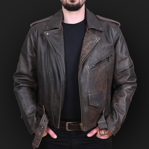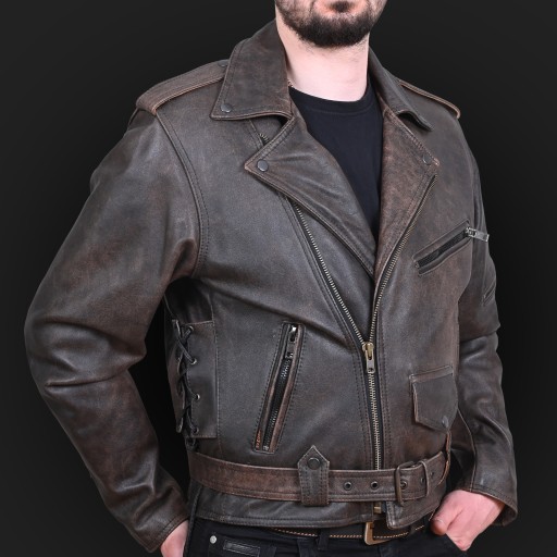Kurtka motocyklowa o klasycznym kroju "ramoneska". Wykonana z polskiej bydlęcej skóry o grubości 1.2 mm . Kolor "Stara Ameryka" Brąz przecierany . Posiada wewnętrzne kieszenie na protektory oraz odpinaną podpinkę / ocieplacz. Kurtka posiada dwie funkcjonalne kieszenie wewnątrz oraz pięć kieszeni na zewnątrz .