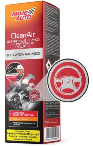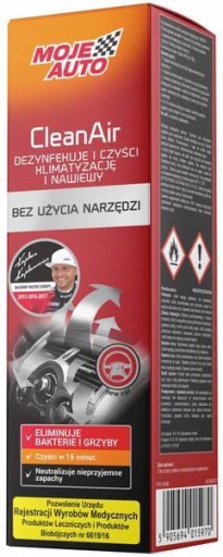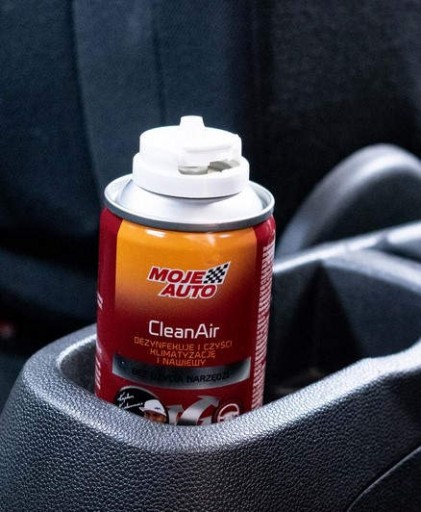 Moje Auto CleanAir - Odświeżacz klimatyzacji i nawiewów to skuteczny preparat do dezynfekcji nawiewów i systemów klimatyzacji w pojazdach. Usuwa nieprzyjemne zapachy spowodowane zaleganiem zanieczyszczeń i wilgocią zapewniając świeżość w pojeździe. Eliminuje bakterie i grzyby. Odświeża wnętrze samochodu. Substancje zawarte w preparacie działają skutecznie już po 15 minutach.