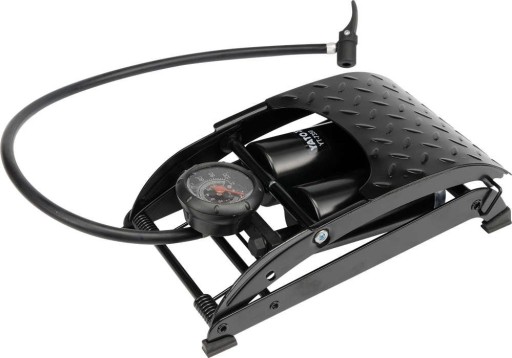 Pompka nożna dwutłokowa o solidnej konstrukcji, wykonana z tłoczonej, lakierowanej blachy stalowej o grubości 3 mm. Manometr z odczytem do 7 barów.